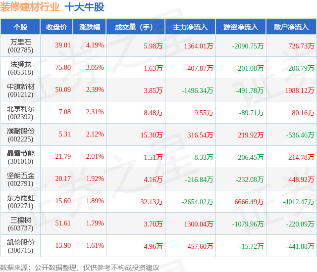 证券之星动静,4月1日,沪指报收3948。55,较前一买卖日上涨1。46%。拆建筑材行业全体表示较弱,较前一买卖日上涨1。03%,23只个股上涨,9只个股下跌。拆建筑材行业当日领涨股为万里石(002785),该股当日报收39。01,上涨4。19%,成交量5。98万,从力资金净流入1364。01万元。法狮龙(605318)以上涨3。05%紧随其后,该股当日成交量1。63万,从力资金净流入407。87万元。除此之外,中旗新材(001212)、利尔(002392)、濮耐股份(002225)均进入当日牛股之列。具体个股列表见下表。